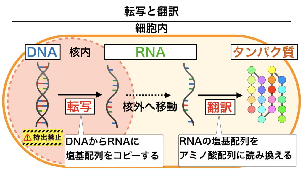 実際に細胞内ではどのようになっているのでしょうか。細胞内の様子を図で示しました。細胞の核内にはDNAが収められています。DNAはとても大切なものなので、核の外に持ち出すことができません。そこで、同じ核酸であるRNAに塩基配列をコピーしますが、これを転写と言います。次に、転写されたRNAが核の外へ移動します。ここで塩基配列が解読され、アミノ酸が組み合わされていくのです。これを翻訳と言います。このようにしてDNAからRNA、タンパク質へと遺伝情報が流れていきます。