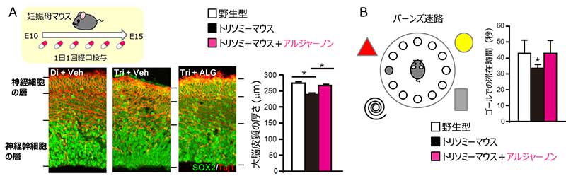 本研究グループは、ダウン症で低下している神経幹細胞の増殖を促進する化合物を探索し、候補化合物アルジャーノン(ALGERNON:altered generation of neuron)を取得しました。アルジャーノンはDYRK1Aの働きを抑制する活性をもち、ダウン症iPS細胞に加えると神経幹細胞が正常に増えるようになりました。またアルジャーノンをマウスに投与すると、神経幹細胞の増殖を促すことが確認されました。妊娠マウスにアルジャーノンを投与したところ、ダウン症マウス仔の大脳皮質の形成異常および低下した学習行動が改善されました。このことは、胎児期にアルジャーノンを投薬して神経幹細胞の増殖を促すことにより、神経幹細胞の増殖低下により引き起こされる脳構造の異常を改善できる可能性を提示しています。